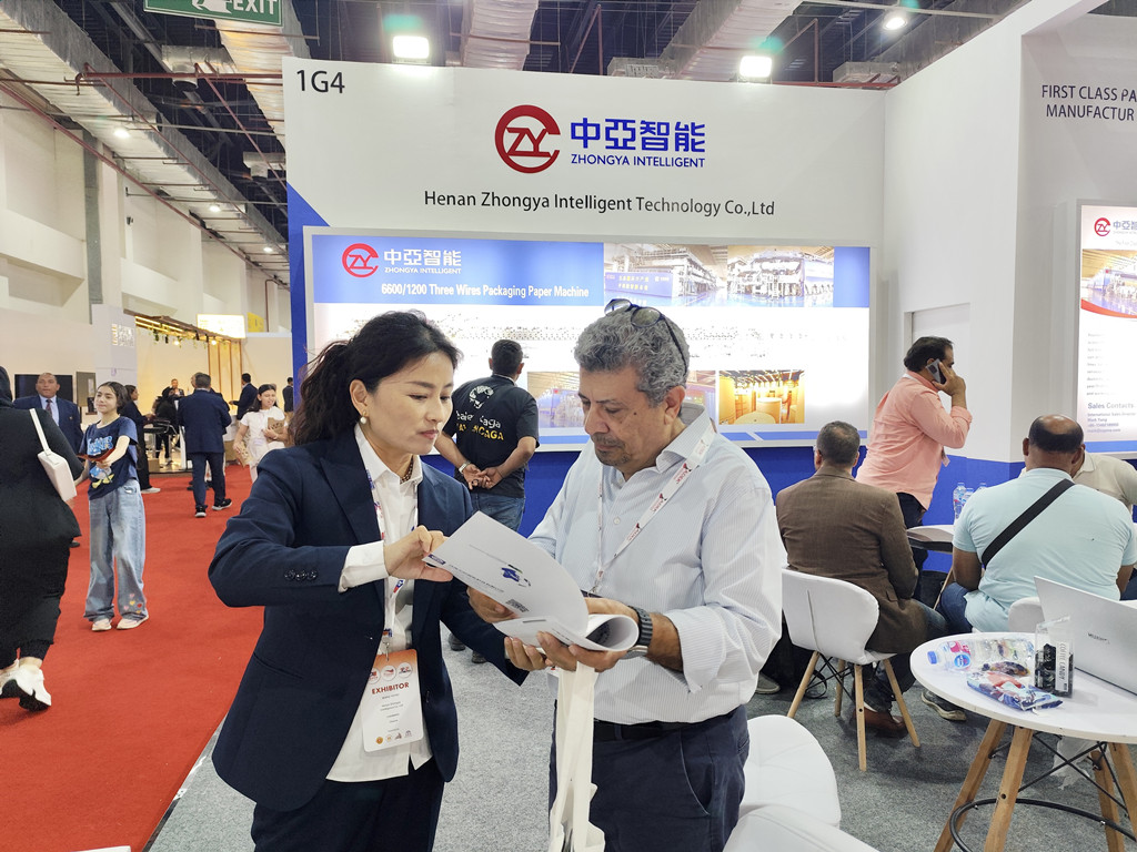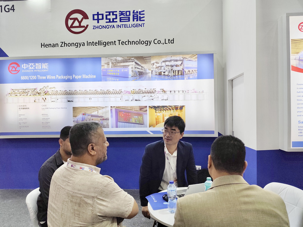 At the exhibition hall, Zhongya's booth was crowded with clients and visitors. Our 6600mm/1200m paper machine, with its exquisite design and outstanding performance, has become the focus of the entire event, attracting plentiful admiring visitors from the Middle East and North Africa. A paper mill owner in Cairo thought highly of Zhongya's R&D technology, precise manufacturing process, especially the energy-saving effect and the paper machine stability. So he had in-depth discussions with our sales team.